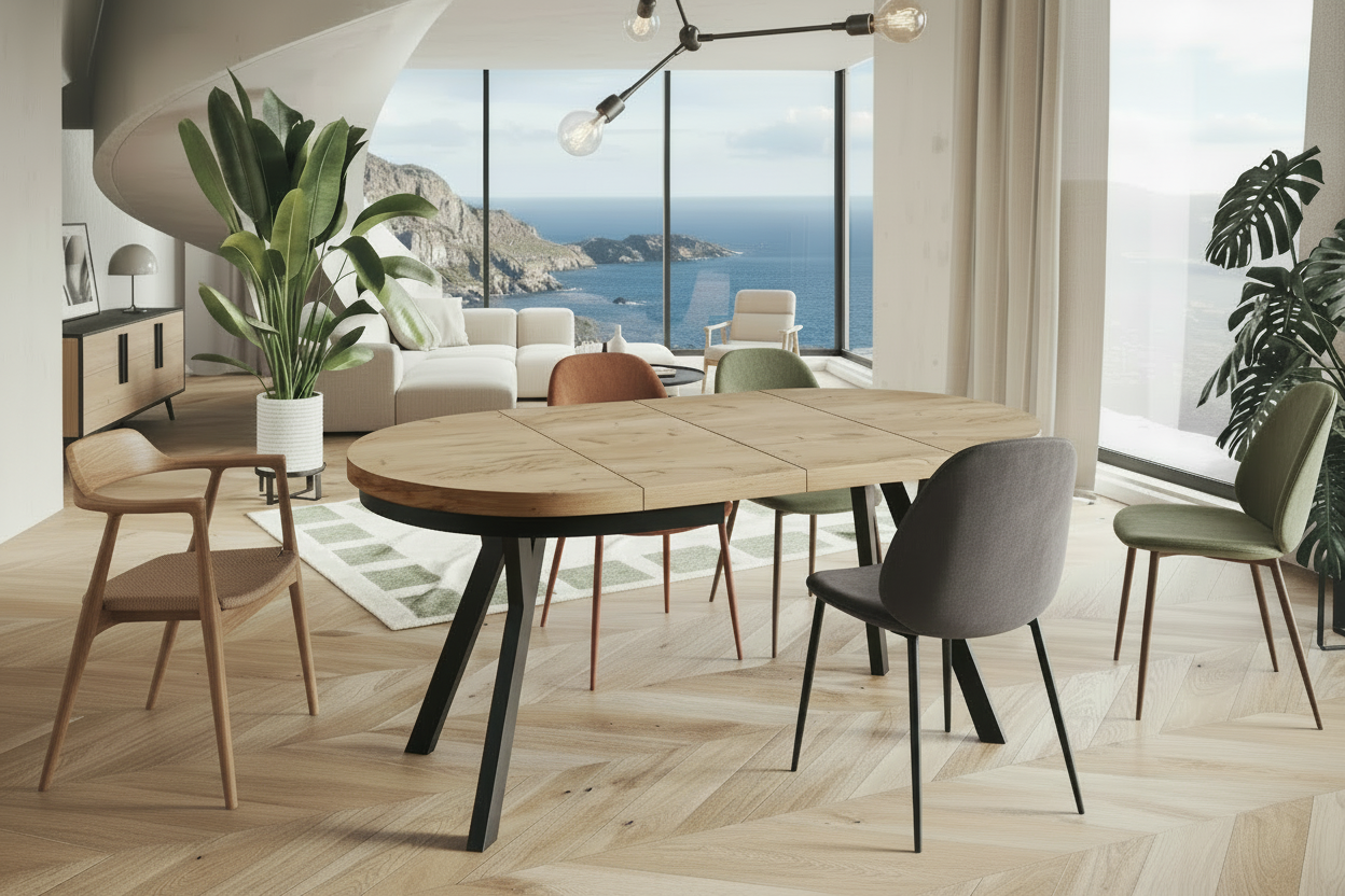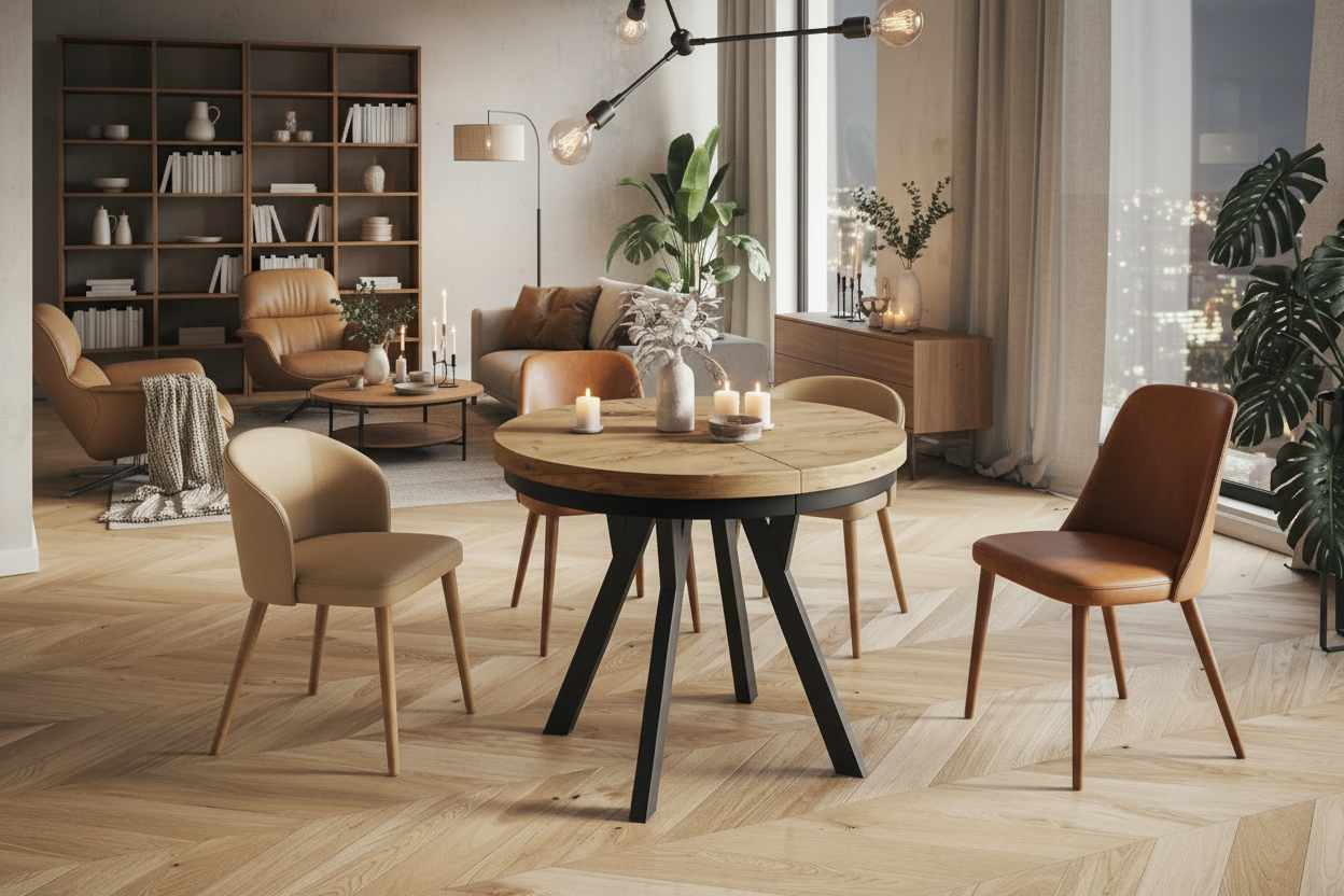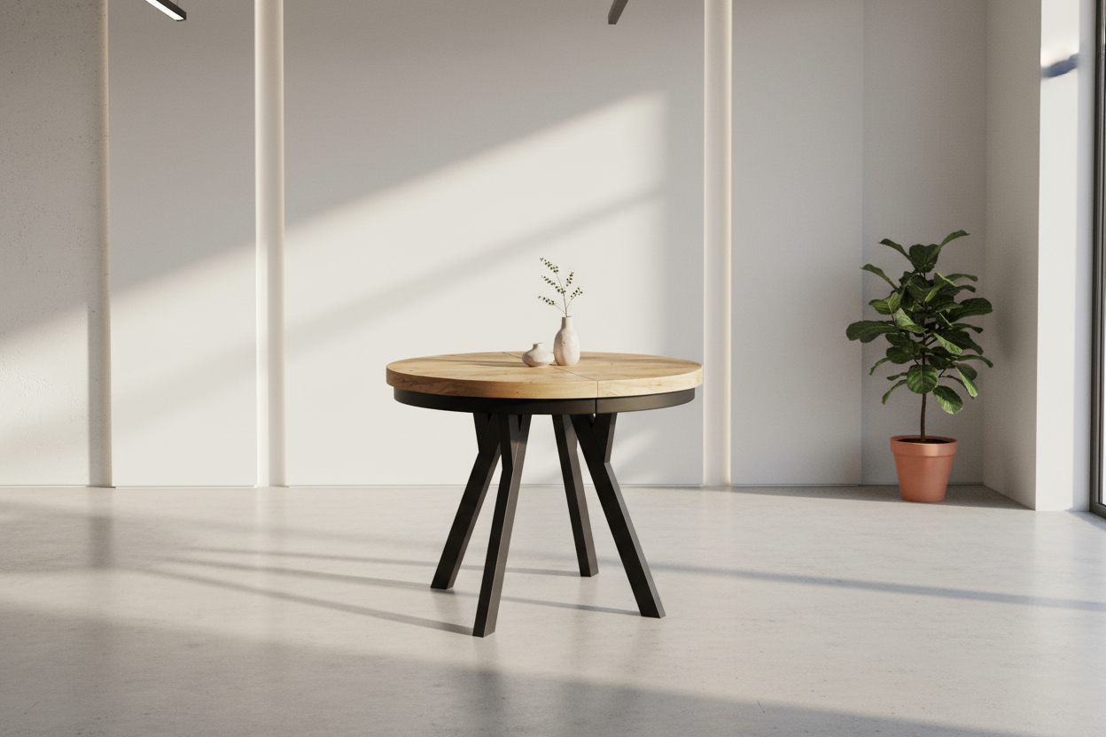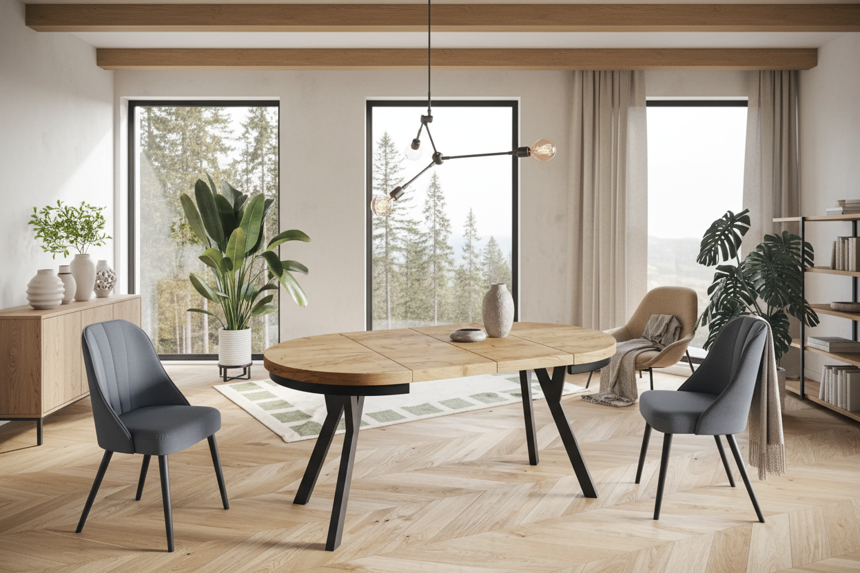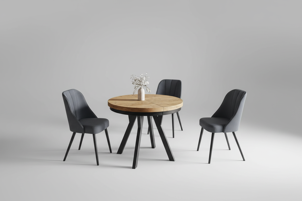 Gamma er et stilrent og funksjonelt rundt spisebord, designet for både hverdagsbruk og hyggelige sammenkomster. Bordplaten er laget av laminert sponplate, belagt med slitesterk PVC-folie, og kantene er forsterket med ABS-list for økt motstandsdyktighet mot slitasje. Finishen gir bordet en varm trestruktur med et naturlig, moderne uttrykk som passer perfekt i skandinaviske og tidløse hjem. Forskjellen mellom Fokus og Gamma er metallrammen rundt undersiden