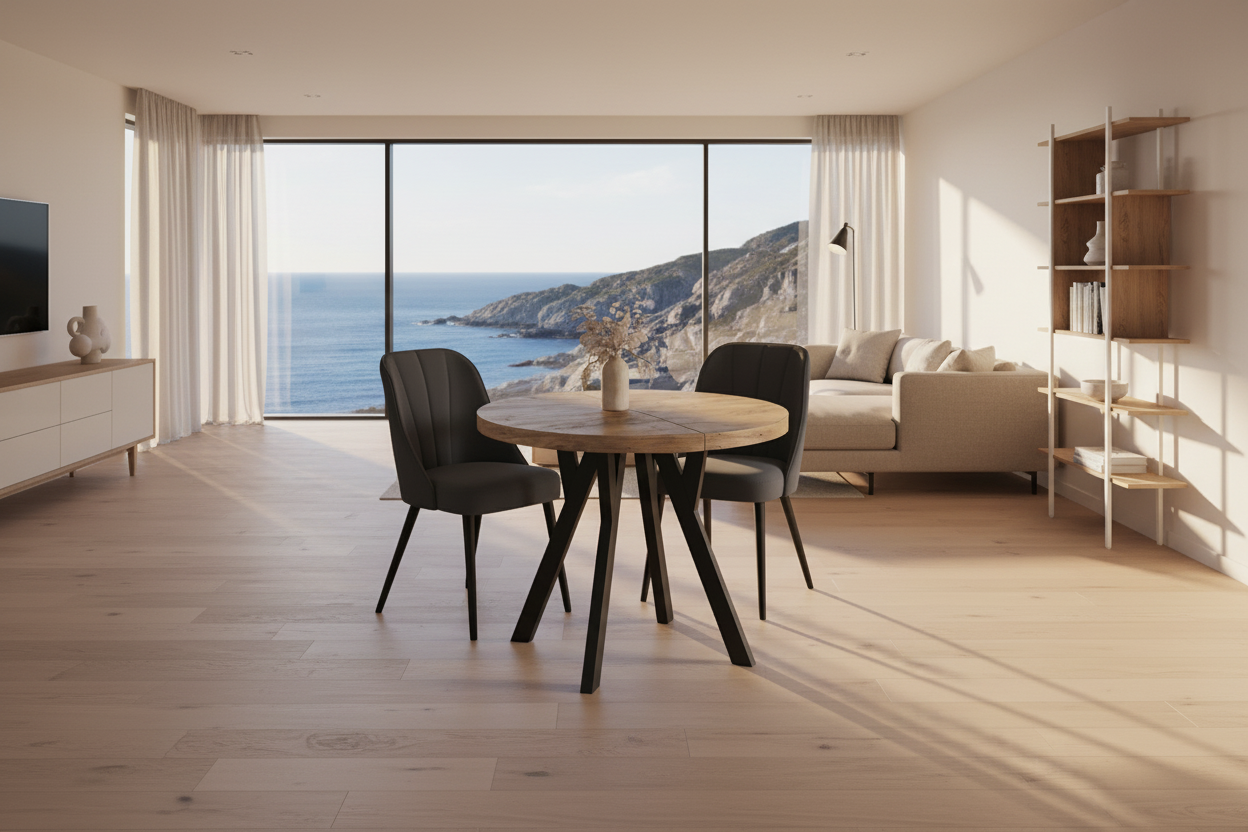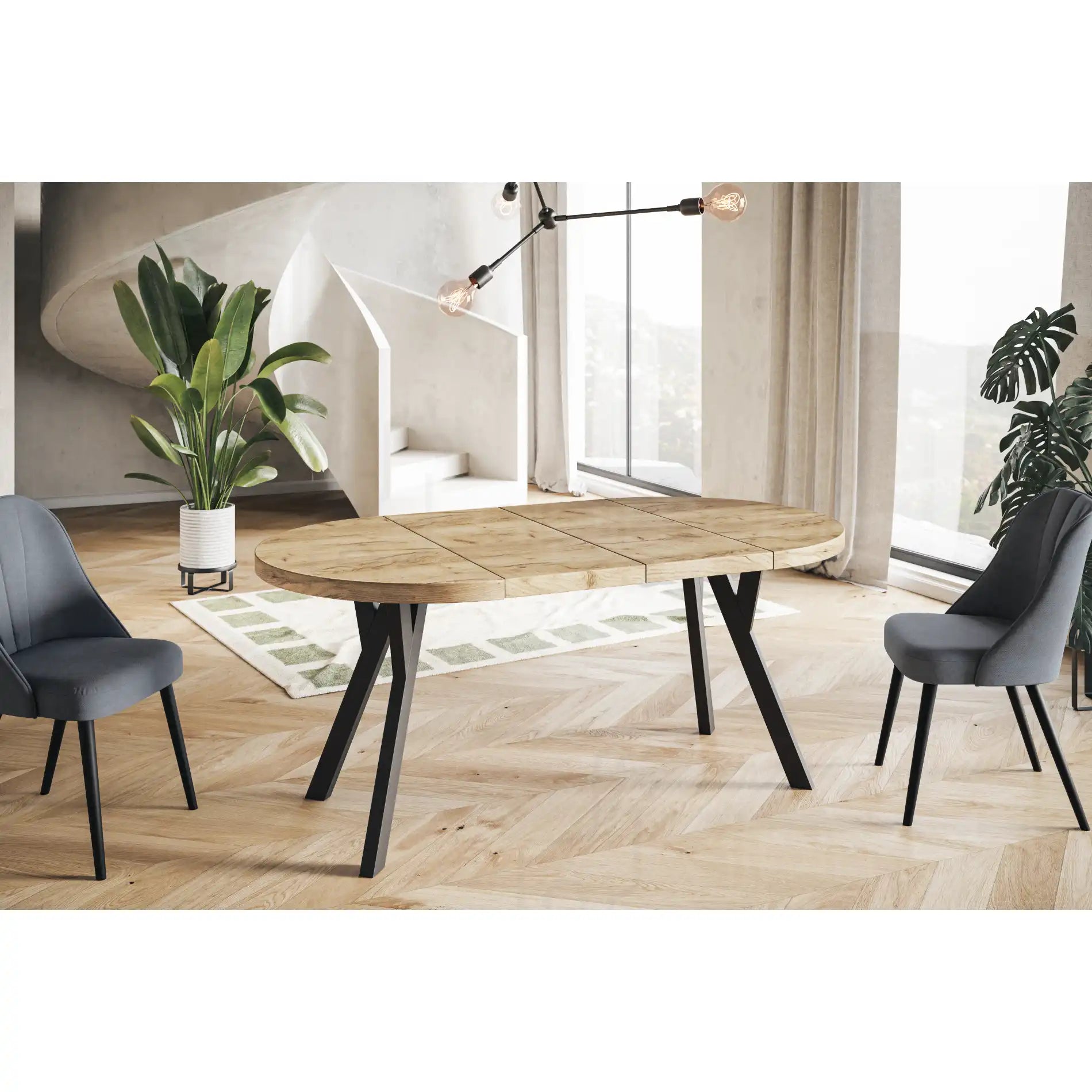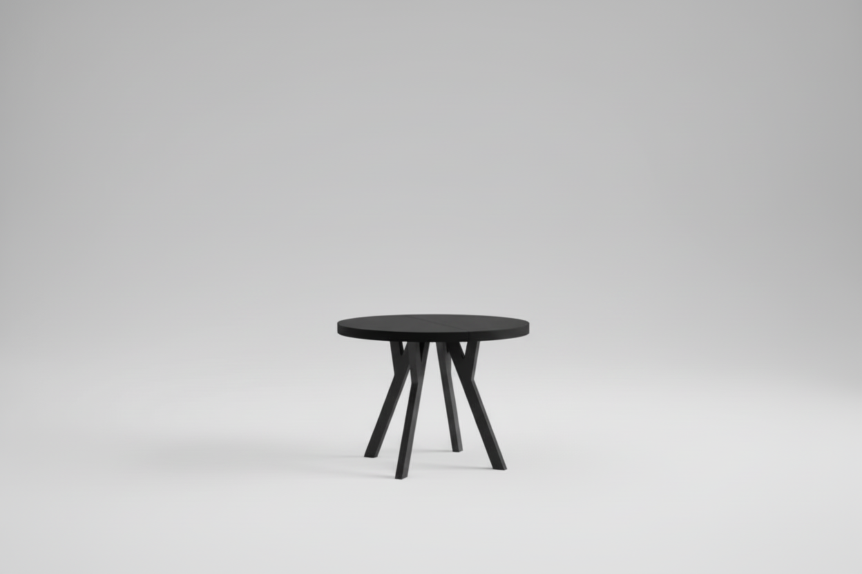 Med en grunnstørrelse på 90 cm i diameter og to innleggsplater på 50 cm hver, kan bordet enkelt utvides til ca. 190 cm – ideelt når du trenger ekstra plass til gjester. Innleggsplatene oppbevares separat for å bevare bordets rene linjer når det er slått sammen.