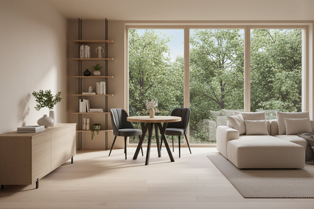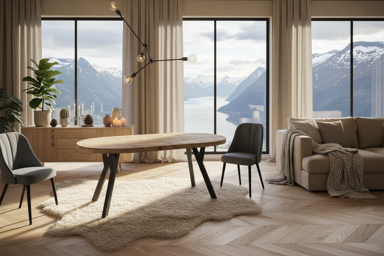 Bordet fremhever lyse tekstiler, grønne planter og moderne metall- eller keramikkdetaljer. Kombiner gjerne med stoler i svart, hvitt eller naturtre for å skape en balansert og innbydende atmosfære.