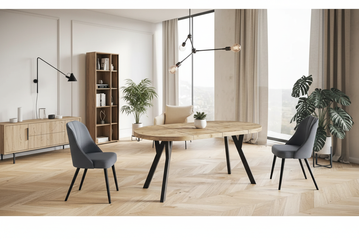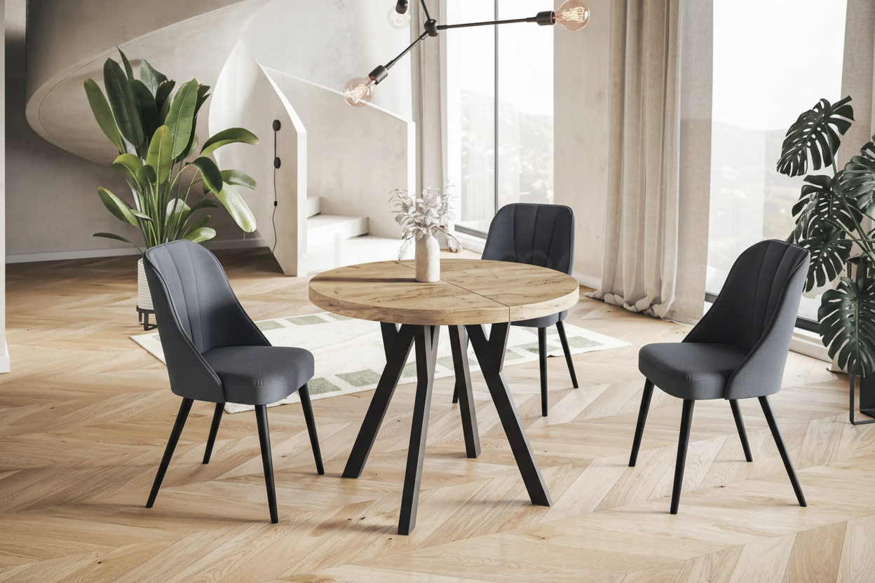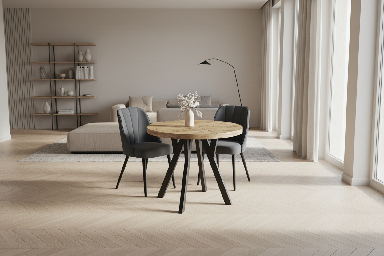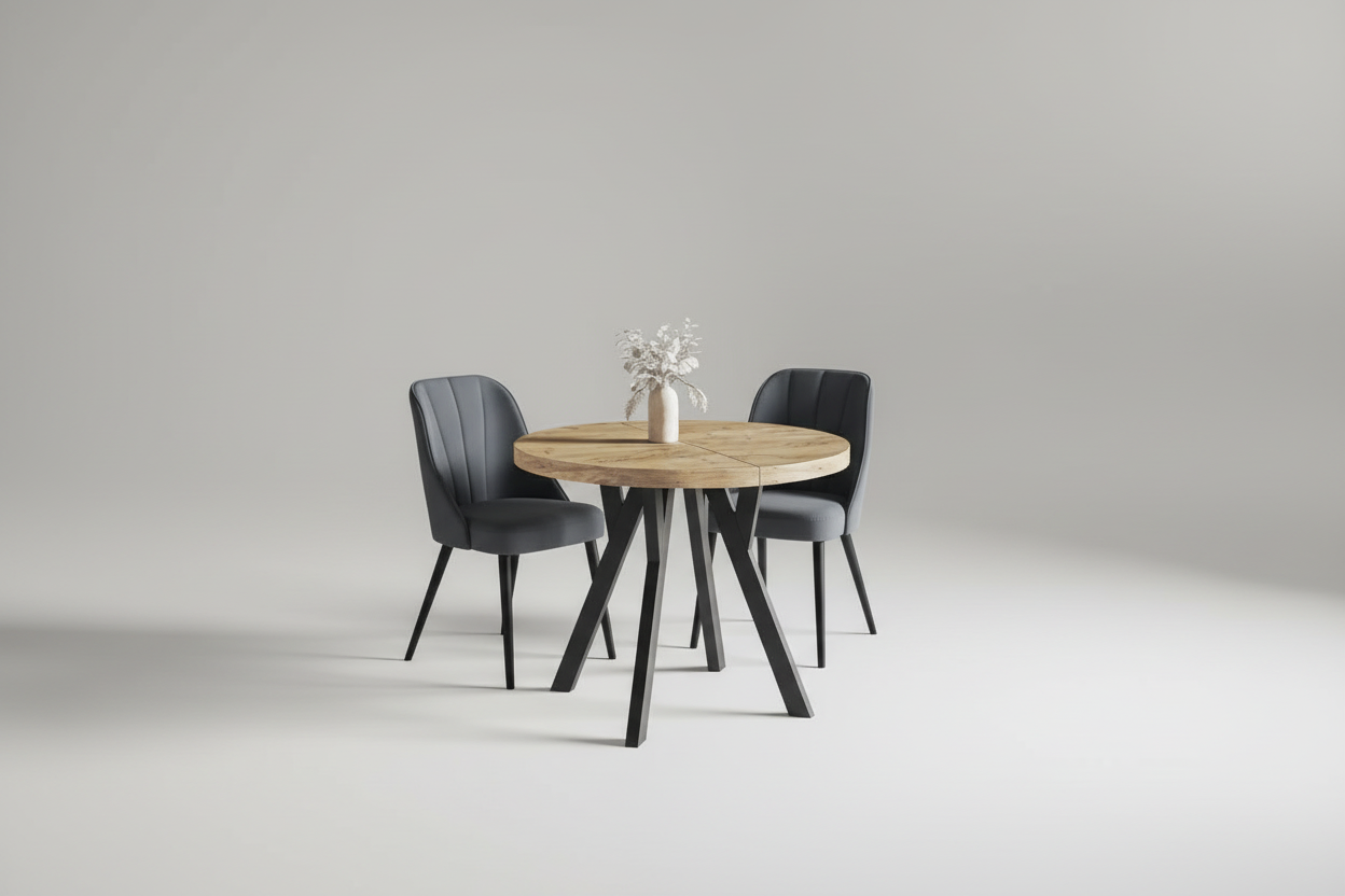 Fokus er et stilrent og funksjonelt rundt spisebord, designet for både hverdagsbruk og hyggelige sammenkomster. Bordplaten er laget av laminert sponplate, belagt med slitesterk PVC-folie, og kantene er forsterket med ABS-list for økt motstandsdyktighet mot slitasje. Finishen gir en varm trestruktur med et naturlig, moderne uttrykk som passer perfekt i skandinaviske og tidløse hjem. Forskjellen mellom Fokus og Gamma er metallrammen rundt undersiden