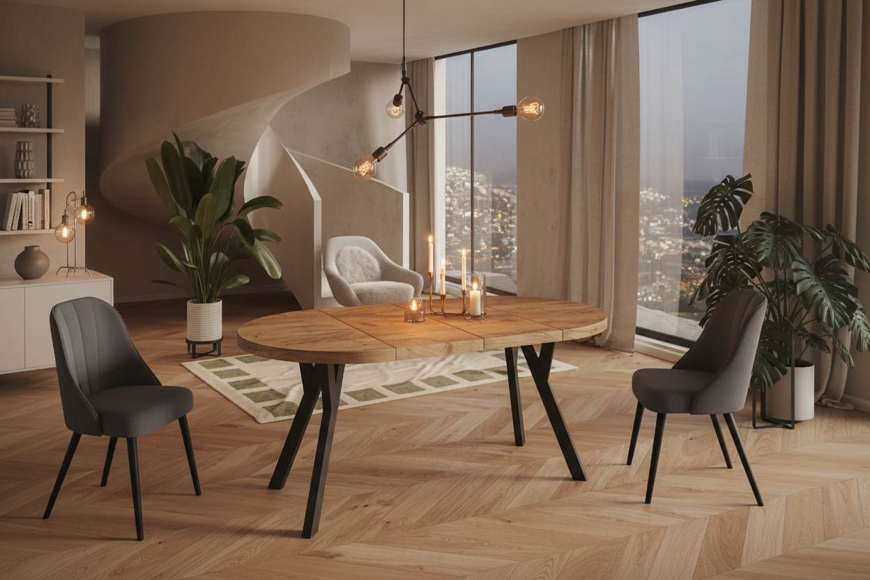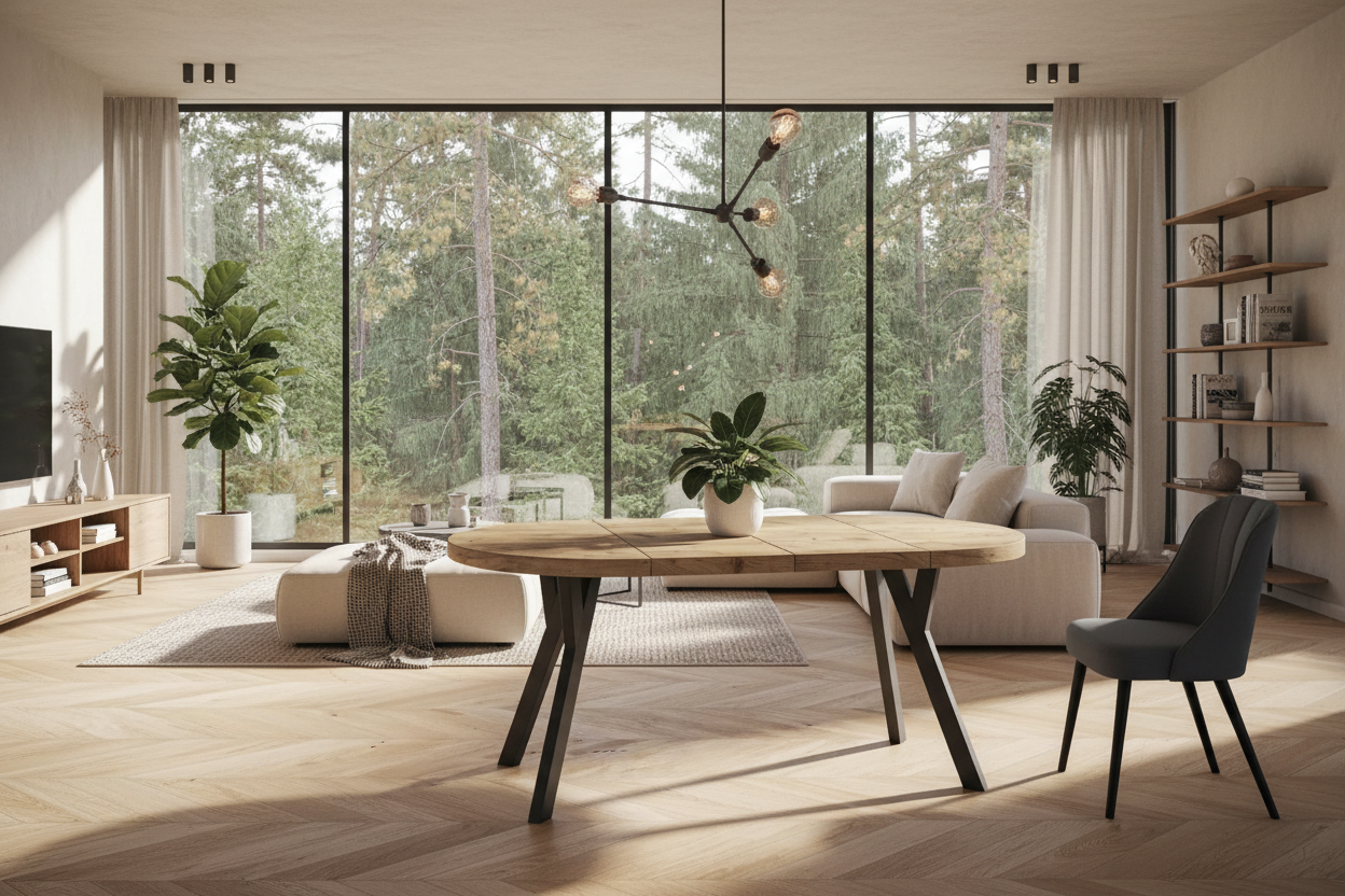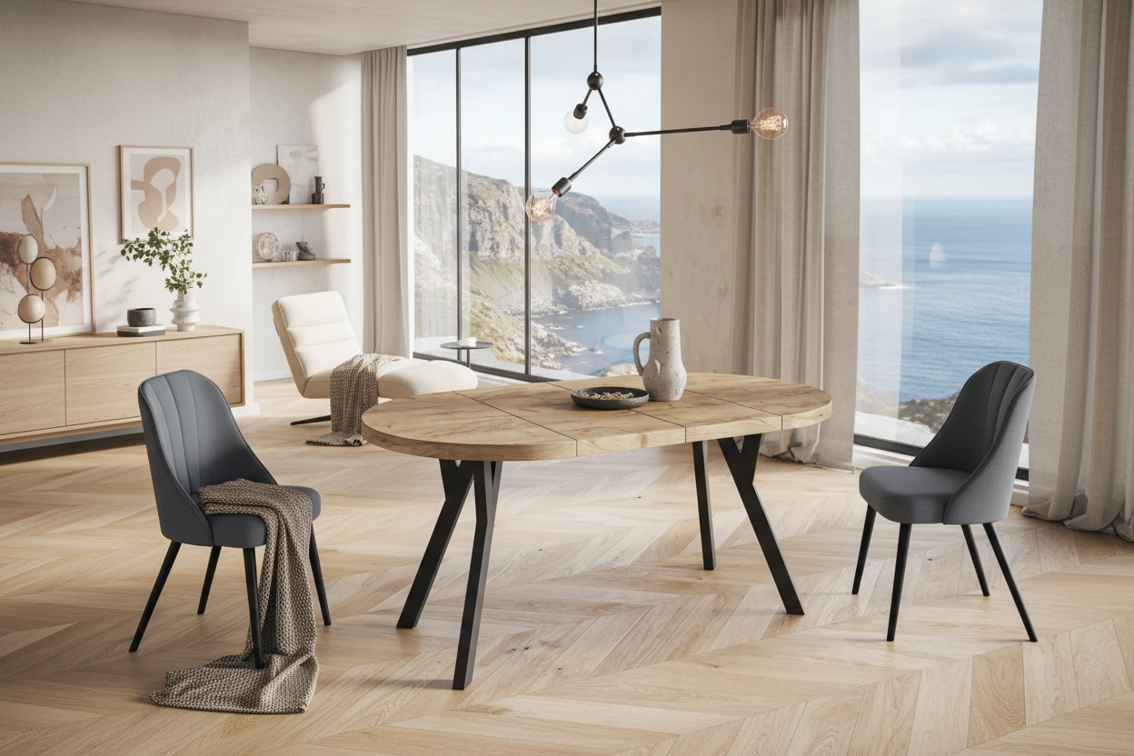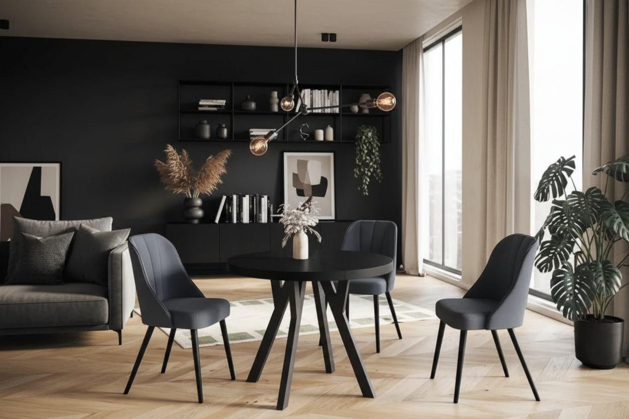 Fokus er et stilrent og funksjonelt rundt spisebord, designet for både hverdagsbruk og hyggelige sammenkomster. Bordplaten er laget av laminert sponplate, belagt med slitesterk PVC-folie, og kantene er forsterket med ABS-list for økt motstandsdyktighet mot slitasje. Finishen gir en varm trestruktur med et naturlig, moderne uttrykk som passer perfekt i skandinaviske og tidløse hjem. Forskjellen mellom Fokus og Gamma er metallrammen rundt undersiden