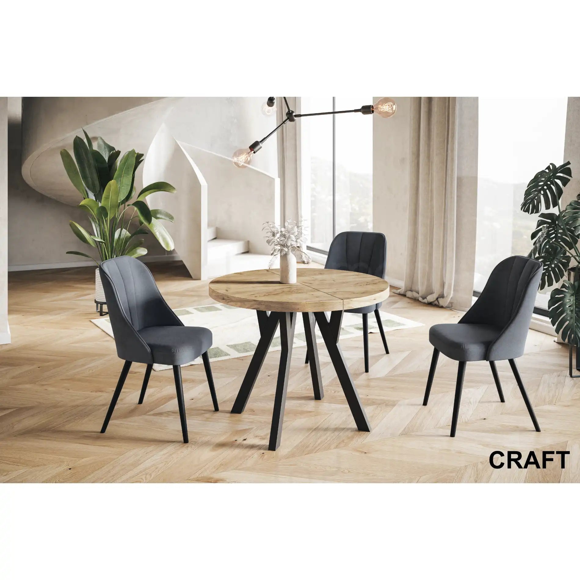 Fokus er et stilrent og funksjonelt rundt spisebord, designet for både hverdagsbruk og hyggelige sammenkomster. Bordplaten er laget av laminert sponplate, belagt med slitesterk PVC-folie, og kantene er forsterket med ABS-list for økt motstandsdyktighet mot slitasje. Craft-finishen gir bordet en varm trestruktur med et naturlig, moderne uttrykk som passer perfekt i skandinaviske og tidløse hjem. Forskjellen mellom Fokus og Gamma er metallrammen rundt undersiden