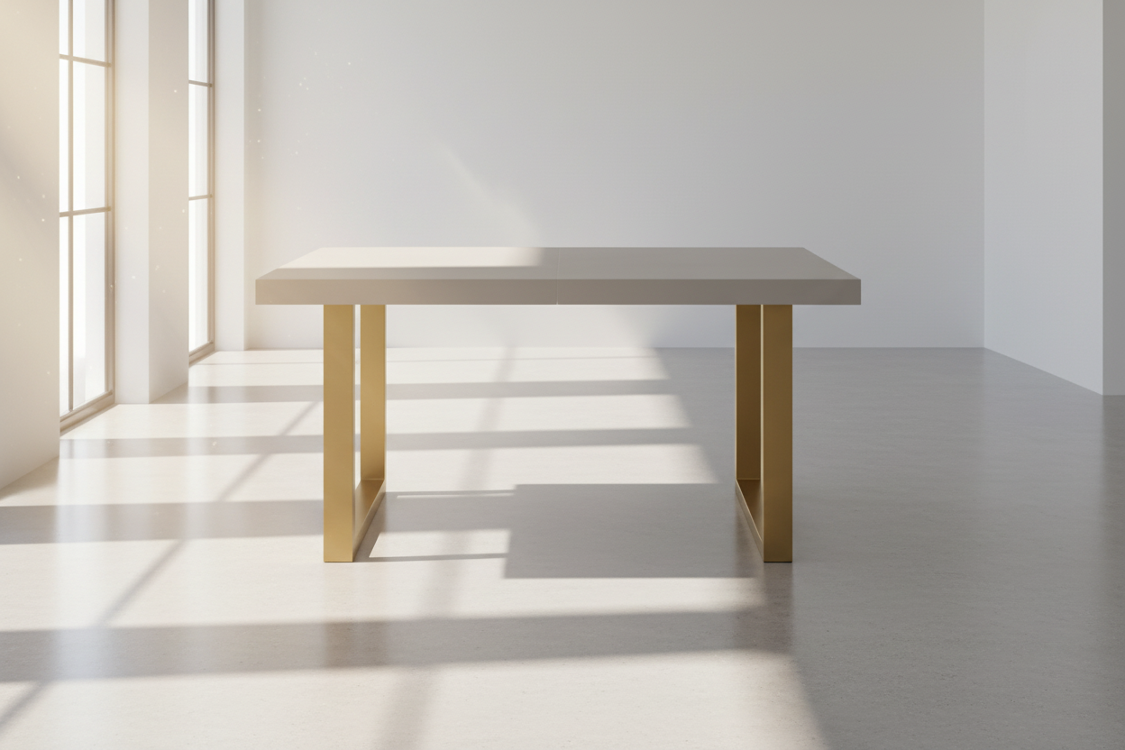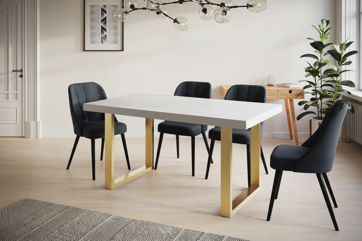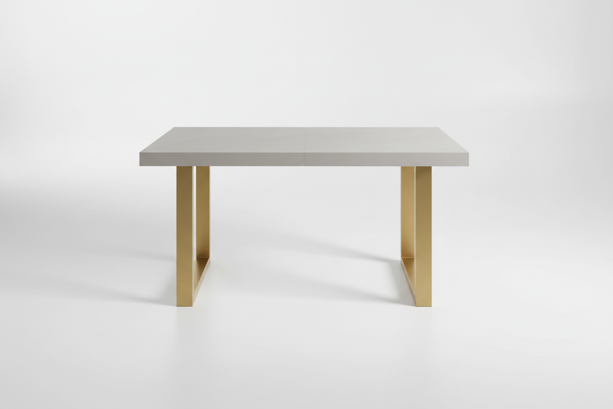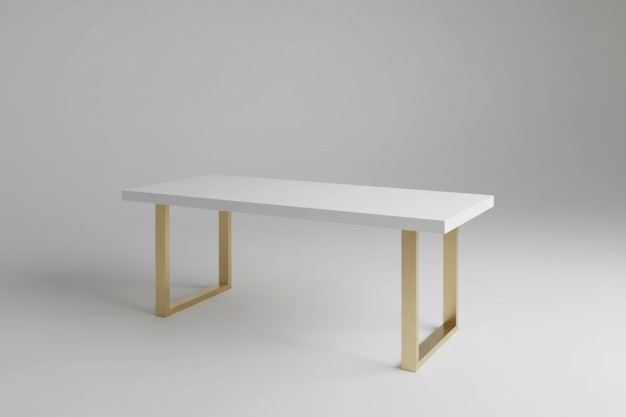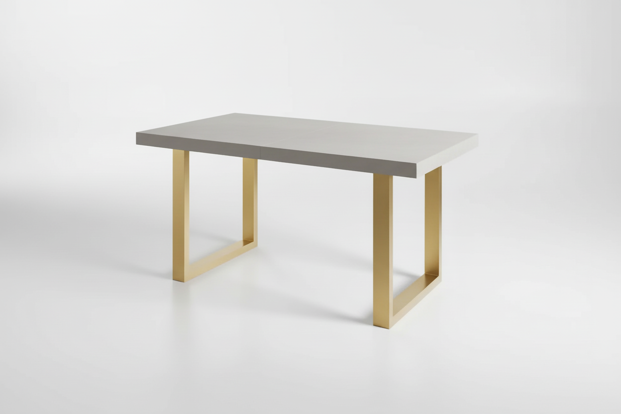 Craft Gold er et unikt bord med metallben lakkert i gull og bordplate i laminert plate. Dette bordet kombinerer funksjonalitet og eleganse. Den ekstra tykke bordplaten i laminert plate (hele 5 cm tykk) gir høy slitestyrke og motstand mot daglig bruk. Solide metallben, pulverlakkerte for ekstra holdbarhet, sørger for stabilitet og et moderne uttrykk. En ekstra fordel er uttrekksystemet med skinner, som gjør det raskt og enkelt å øke bordets størrelse slik at det er plass til alle gjestene.