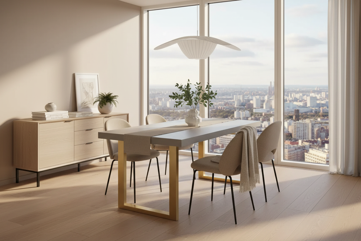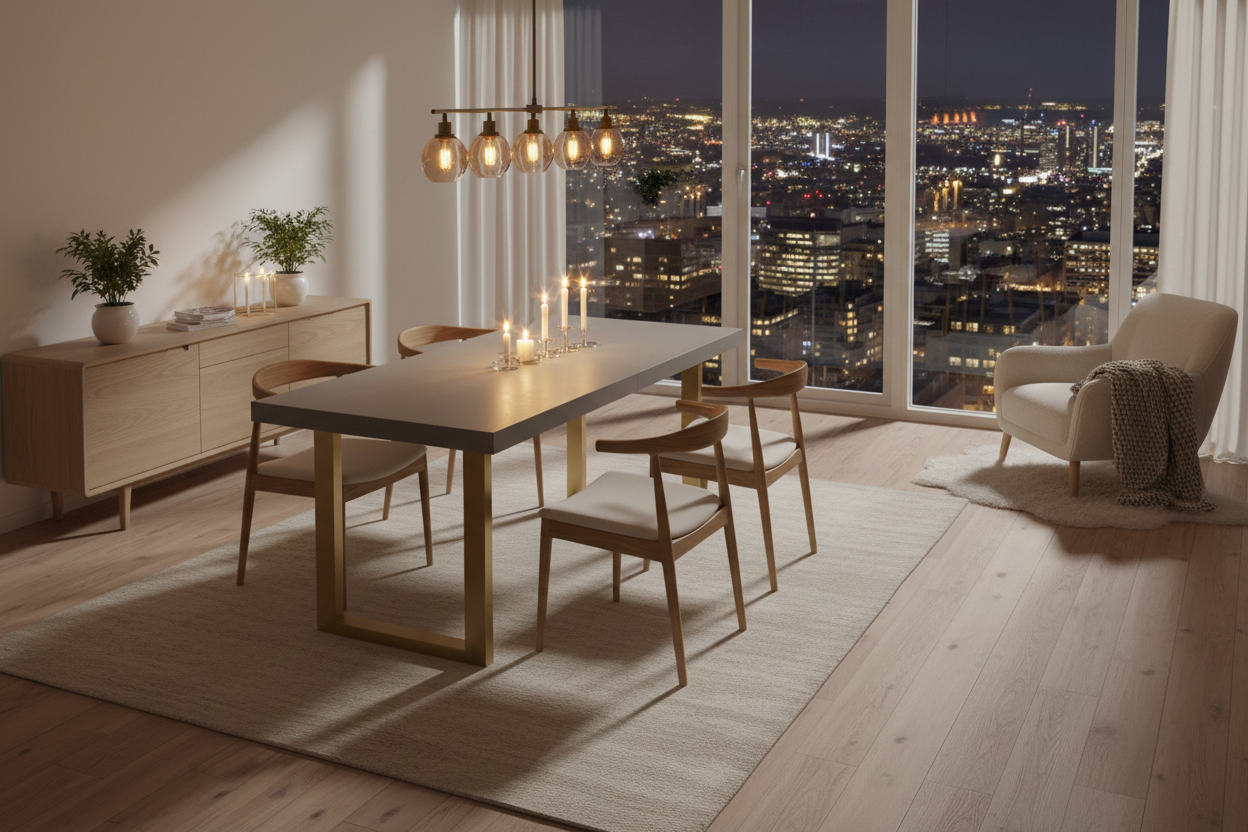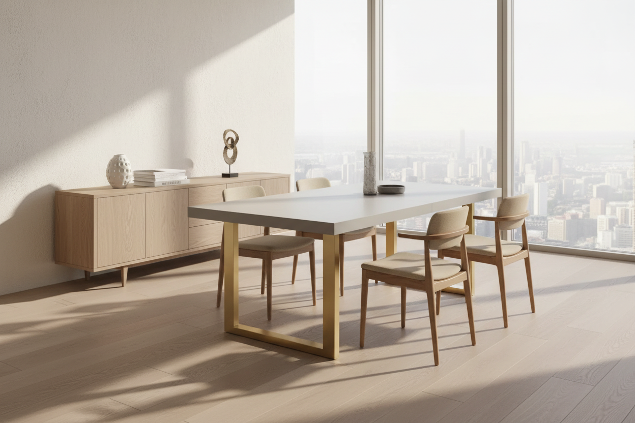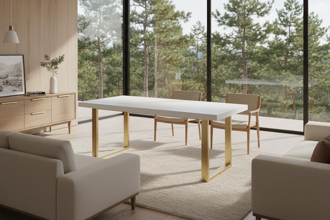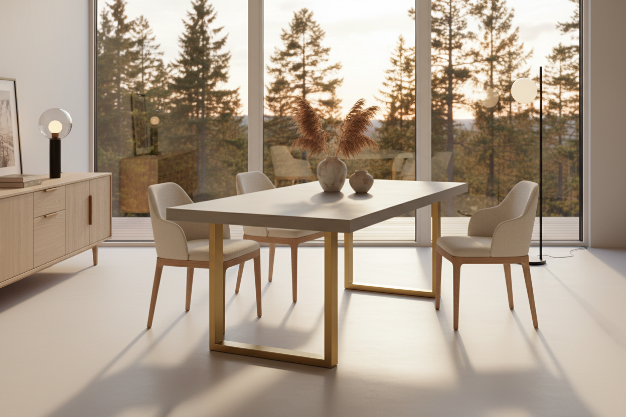 Craft Gold er et unikt bord med metallben lakkert i gull og bordplate i laminert plate. Dette bordet kombinerer funksjonalitet og eleganse. Den ekstra tykke bordplaten i laminert plate (hele 5 cm tykk) gir høy slitestyrke og motstand mot daglig bruk. Solide metallben, pulverlakkerte for ekstra holdbarhet, sørger for stabilitet og et moderne uttrykk. En ekstra fordel er uttrekksystemet med skinner, som gjør det raskt og enkelt å øke bordets størrelse slik at det er plass til alle gjestene.
