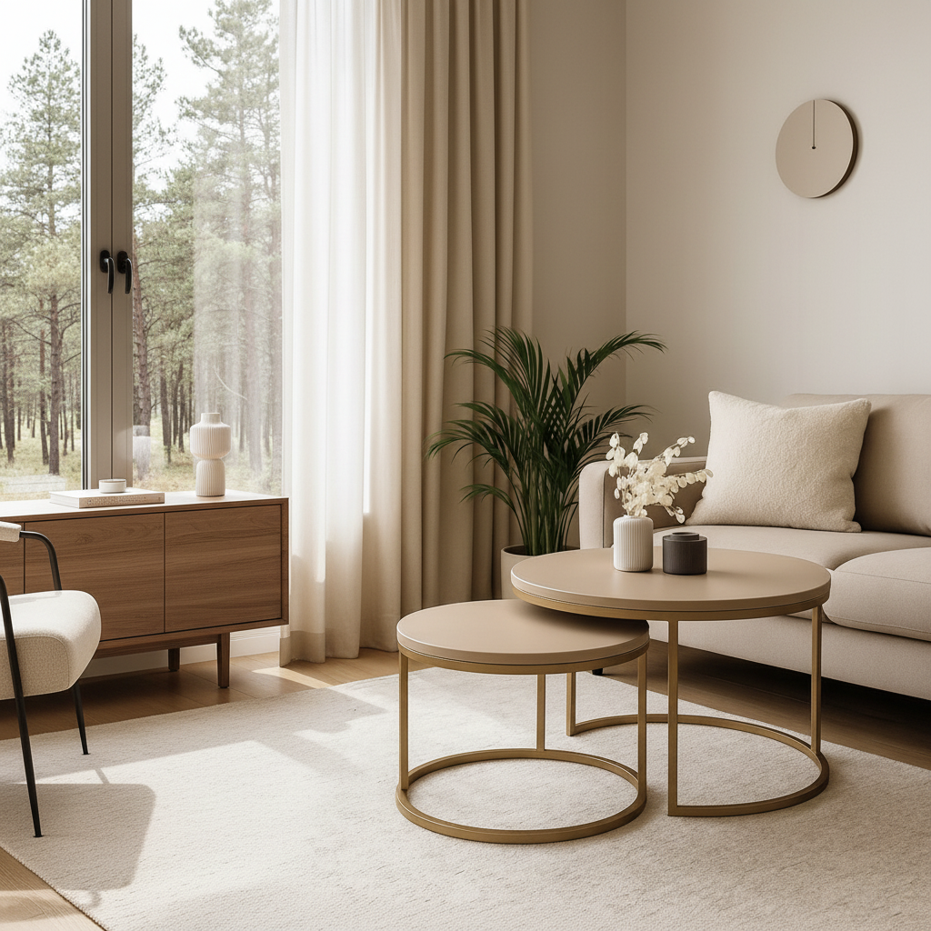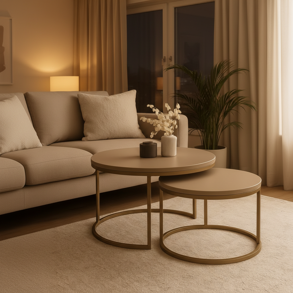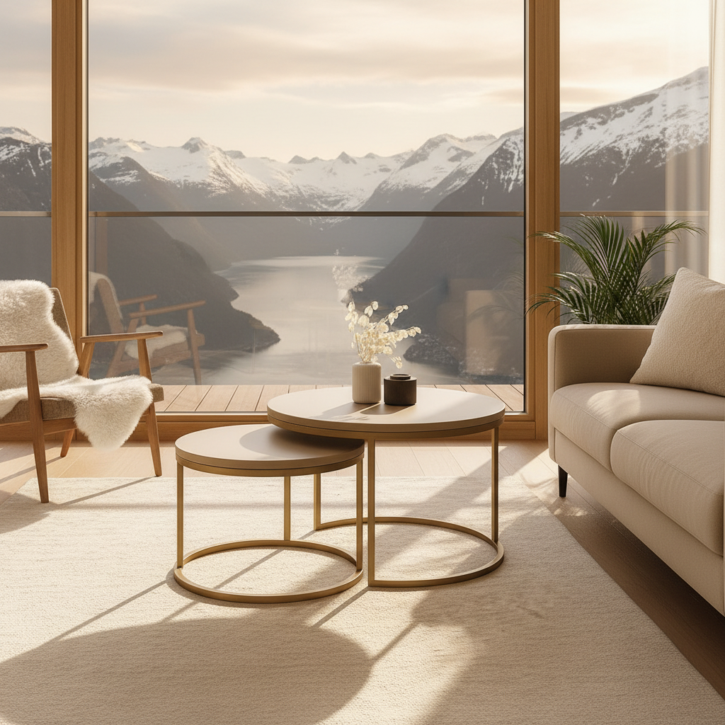 Tenk deg at bordene står side om side som to stille, gode venner – en hverdagslig oase midt i stua. Det større bordet inviterer til samtaler og lekre kaffekopper, mens det mindre står stabilt ved siden av som et stille rom for bøker eller dekor. Når du ønsker å ommøblere, glir de lett fra hverandre — det er både funksjon og følelse i perfekt balanse.