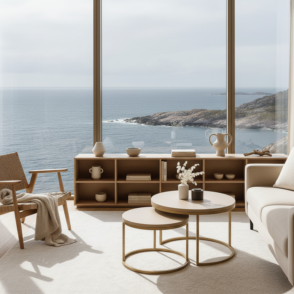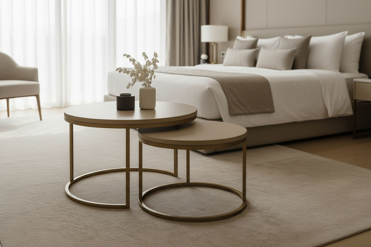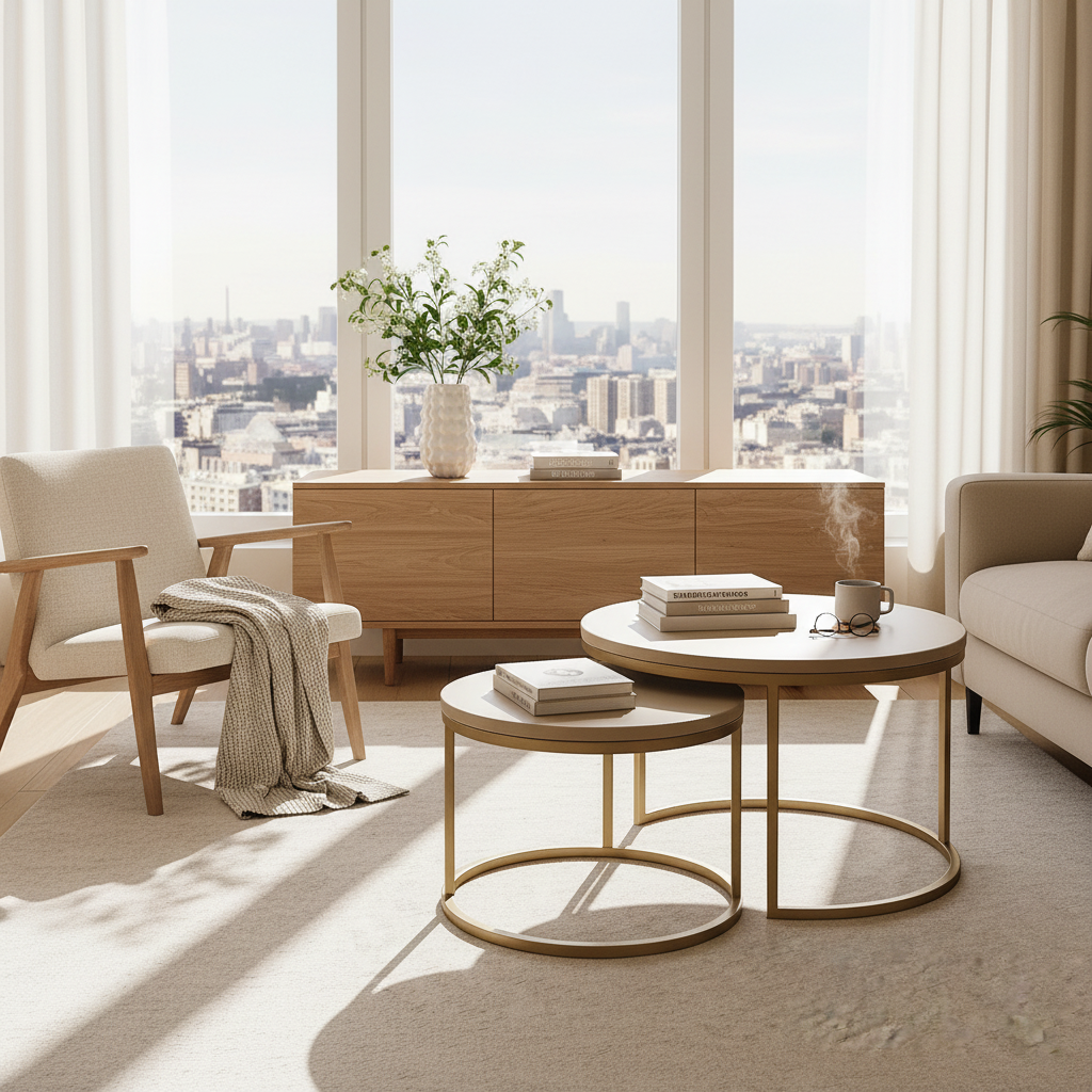 Tenk deg at bordene står side om side som to stille, gode venner – en hverdagslig oase midt i stua. Det større bordet inviterer til samtaler og lekre kaffekopper, mens det mindre står stabilt ved siden av som et stille rom for bøker eller dekor. Når du ønsker å ommøblere, glir de lett fra hverandre — det er både funksjon og følelse i perfekt balanse.