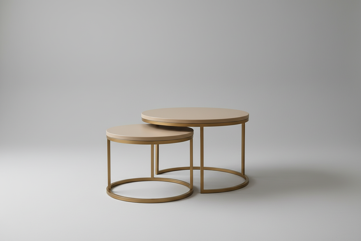 Forestill deg et rolig morgenlys som glitrer mot en matt bordplate i myk kashmirfarge, balansert av en elegant gulldetaljert stålramme. Det er mer enn bare et par bord – det er en sanselig opplevelse som forvandler stuen med sitt balanserte møte mellom varme jordtoner og luksuriøse detaljer. Stilretningen Japandi møtes i et slående uttrykk, hvor japansk enkelhet kombineres med skandinavisk funksjon og bohemske innslag.